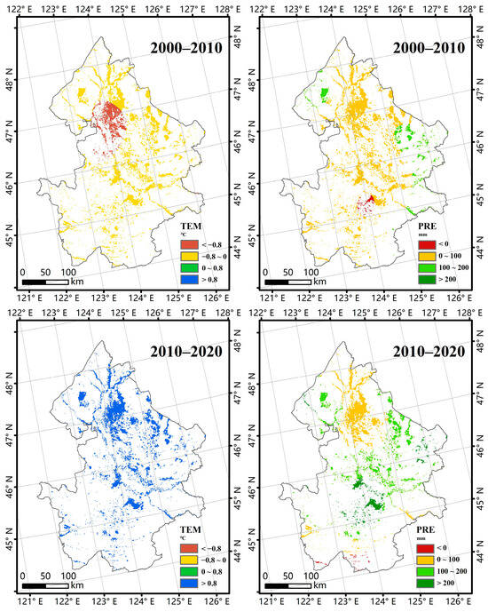 Spatiotemporal changes in temperature (TEM) and precipitation (PRE) over the western Songnen Plain from 2000 to 2010 and from 2010 to 2020.