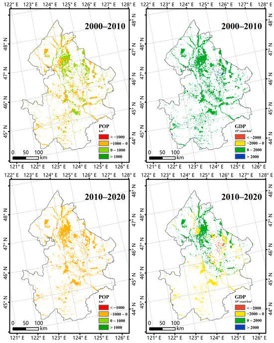 Although the western Songnen Plain has been an important agricultural area, overall population density and GDP were relatively low. The cities or towns, which were mainly distributed in the north, correlated with spatial clusters of high values of POP and GDP (Figure 7). From 2000 to 2020, the POP saw limited growth, while GDP increased substantially by 62%. However, the population experienced a decline from 2010 to 2020 across the study area, while GDP in the southern areas had declined in the same decade.