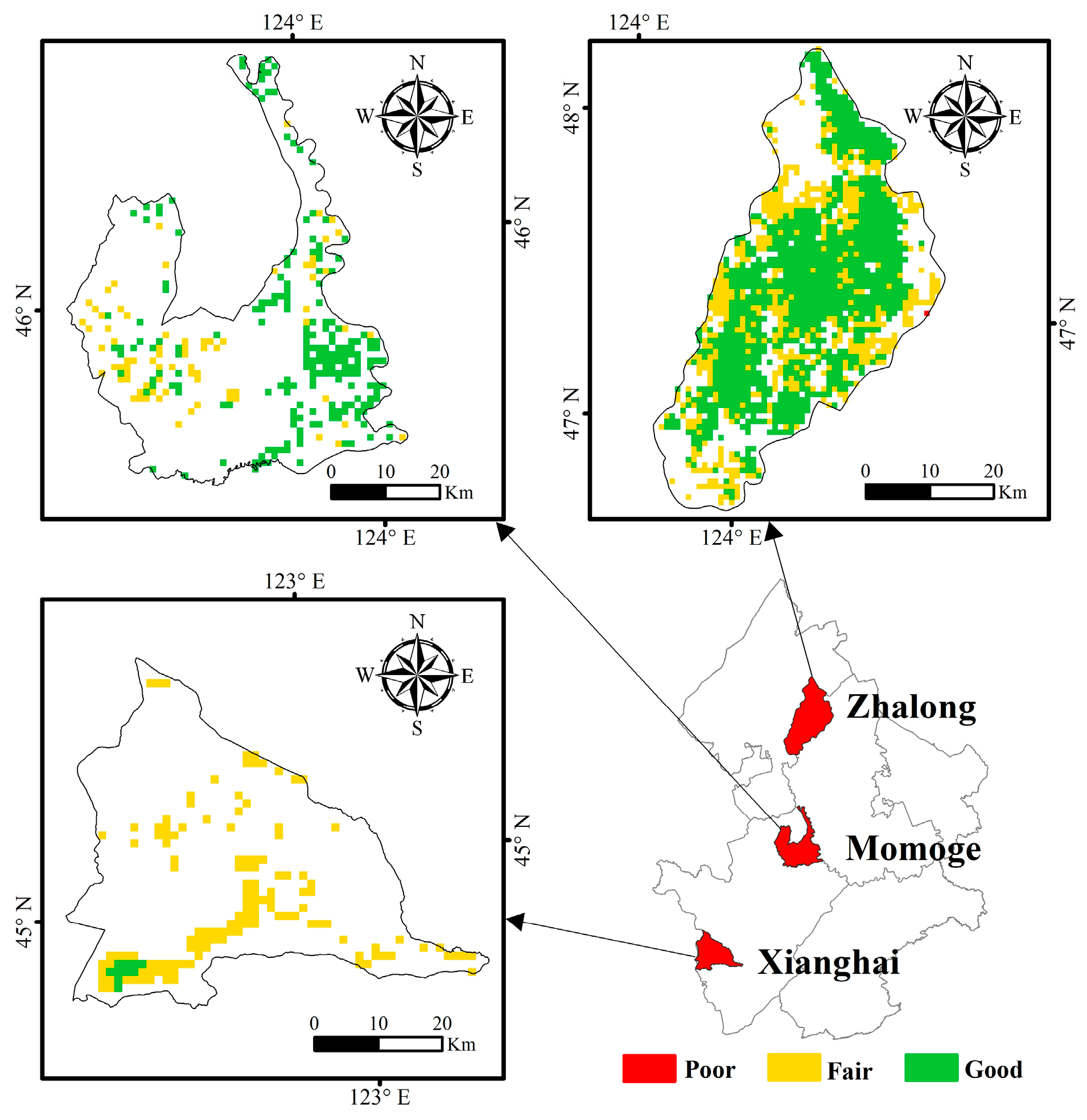 - Tian, Y.; Wang, Z.; Mao, D.; Li, L.; Liu, M.; Jia, M.; Man, W.; Lu, C. Remote observation in habitat suitability changes for waterbirds in the west Songnen Plain, China. Sustainability 2019, 11, 1552. [Google Scholar] [CrossRef]