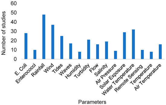 Sunlight and salinity are critical to FIB persistence in bathing waters [9,16]. Solar radiation contributes to bacterial inactivation by damaging DNA and cellular structures [35]. In the reviewed studies, multiple solar-related parameters were utilised, such as cumulative solar exposure, total sunshine hours over defined intervals (24/48/72 h), cloud cover, and UV index (including cumulative UV exposure and maximum UV dose) [19]. Additionally, weather parameters such as air and water temperature [15,35], last day solar radiation [21], and water surface temperature [2,18,35] were also analysed across several studies.
