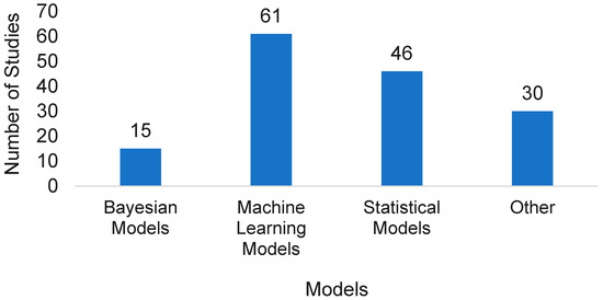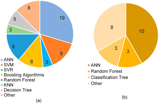 Among the ML algorithms, ANNs were used in 19 studies, followed by RF (9), SVM (9), Boosting algorithms (8), DT (5), K-Nearest Neighbours (3), Support Vector Regression (3), and eight other ML models, as shown in Figure 6a. Out of 63 studies taken into account, it has been observed that many researchers used multiple models or different models from the same category. For example, Džal et al [69] used RF, ANNs, and a hybrid model of ANNs and RF, while Zhang et al [70] used different variations of ANNs like NIO, NAR, and NARX. Therefore, finding the best-performing ML model for each study is crucial. It was observed that ANNs were the best performers in 10 studies, followed by RF (3), CT (3), and other ML models (8), as illustrated in Figure 6b. It should also be noted that these are statistics from the reviewed studies. For instance, ten studies found the ANN to be the best-performing model in their respective contexts. These results should not be interpreted as direct model comparisons, as each study used different datasets and experimental conditions.
