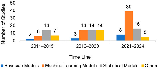The review covers studies from 2001 to 2024. Between 2001 and 2005, most studies employed traditional statistical approaches to analyse BWQ. For instance, several studies employed statistical regression models [5,42]. In addition, Boehm and Weisberg [43] applied analyses of variance (ANOVAs) to study water quality trends, reflecting an early reliance on classical statistical methods during this period. In the 2011–2015 period, significant advancements in predictive modelling were observed. Shutler et al [44] introduced AlgaRisk, a web portal for water quality prediction, while Thoe et al [23] compared five models, including an ANN and classification trees (CT), finding that the ANN model reduced errors in beach postings. A 3D deterministic hydrodynamic model was also built to forecast water quality every day [45]. Brooks et al [46] automated the MLR model using PLS. From 2016 to 2020, ML models began to dominate BWQ prediction. ANN and SVR techniques were shown to perform well, with ANNs typically outperforming SVR [47]. A modelling technique combining two models using MLR and CTs was recommended; according to the author, MLR struggles to capture “very poor” WQ levels as the E. coli concentration exceeds 610 count/100 mL, and CT is more accurate [48]. Brooks et al [49] compared 14 regression methods, concluding that RFs were the most accurate for water quality predictions across seven beaches. Between 2021 and 2024, Bayesian approaches gained traction, and studies explored the use of Bayesian updating for data-scarce environments [6], with semi-naïve Bayesian networks (BNs) transferred across multiple sites [19]. Figure 4 illustrates the trend in the choices of the models by researchers for the period of 2001–2024. The “Other” category consists of process-based, hydrodynamic, and baselines (Geometric Mean), whereas Figure 5 shows the trend of models changed with time from 2011 to 2024. Other studies employed Bayesian log-normal mixed effects regression models [5] as well as used the Cogent Confabulation classifier [50]. Various algorithms, such as DTs, ANNs, and Bayesian belief networks, performed well [18], while optimised neural networks showed superior results in other studies [37]. Bourel et al. [38] tested 52 candidate algorithms and found that stratified RFs and SVMs (especially when combined with techniques like SMOTE) were identified as top performers for water quality prediction.