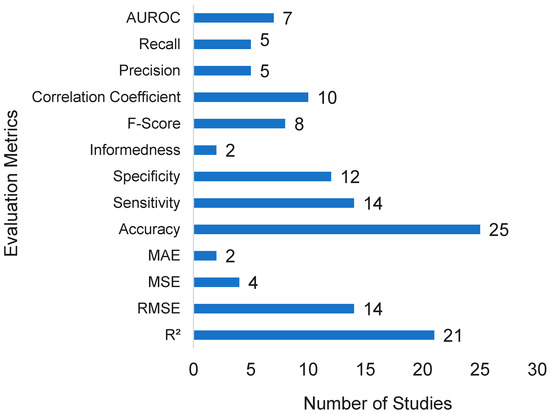 Various evaluation metrics have been used throughout the studies. Among the preferred metrics, Accuracy was used in 25 out of 63 studies, followed by R2 (21), RMSE (14), Sensitivity (14), Specificity (12), and more, as shown in Figure 7. Kendall’s tau correlation, AIC (Akaike’s Information Criterion), and others were among the least appearing metrics. Table A2 in the Appendix A summarizes the key details of the reviewed studies, including the best-performing models, parameter settings, regions examined, and the metrics used.