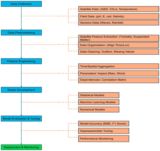 The remote sensing approach provides an alternative method of data collection, wherein information is acquired via satellites, drones, and other aerial platforms. Parameters such as chl-a, turbidity, and total suspended solids (TSSs), which are critical for BWQ predictive modelling, can be derived from satellite-based data and accessed through the Google Earth Engine (GEE) platform. GEE is a cloud-based computing environment designed for large-scale environmental data analysis, offering extensive satellite imagery and remote sensing datasets [37]. It hosts a multi-petabyte, analysis-ready data catalogue integrated with a high-performance, parallel computation service accessible via an API and web-based integrated development environment (IDE). This framework enables the analysis of both public and private geospatial datasets (e.g., Landsat, Sentinel-1/2, climate, and land-cover data) using server-side operators that automatically distribute computational tasks [71].