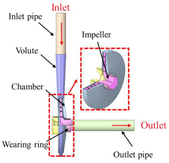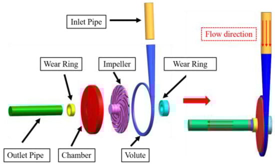 The research object of this study is an USSPAT with a specific speed of 16.52. The PAT primarily consists of a volute, impeller, chamber, and wear rings. A three-dimensional fluid domain model encompassing the entire flow passage of the USSPAT was established. To ensure fully developed flow conditions at the boundaries, the computational domain was extended with straight inlet and outlet pipe sections. The length of each extension was set to five times the respective pipe diameter to minimize the influence of the boundary conditions on the internal flow field simulation. The 3D computational model of the USSPAT is presented in Figure 1, and its main design parameters are listed in Table 1. As its specific speed is significantly lower than the conventional threshold of 30, this machine is classified as an USSPAT. The specific speed is defined as follows: