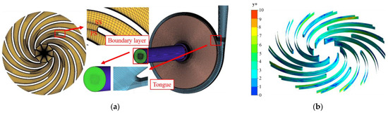 (a) Computational mesh of the fluid domain; (b) Blade Surface Y+ Distribution.
