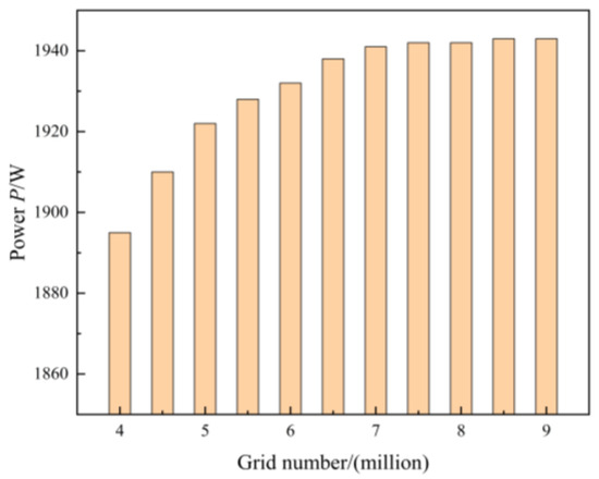 The mesh density significantly impacts both the prediction accuracy of USSPAT performance and computational time. To ensure simulation precision while improving computational efficiency, a grid independence study was conducted for the USSPAT. Eight distinct mesh schemes with varying cell counts were generated for numerical simulation. Figure 3 presents the computational results under different mesh densities, demonstrating that the output power of the USSPAT increases continuously with mesh refinement. When the cell count reaches 7.94 million, further mesh densification yields negligible changes in output power. Accordingly, the mesh configuration with 7.94 million cells was ultimately adopted for all subsequent computations.