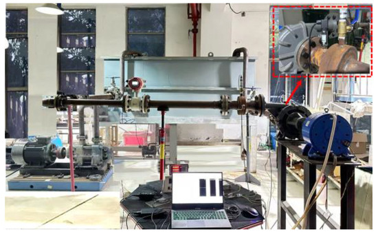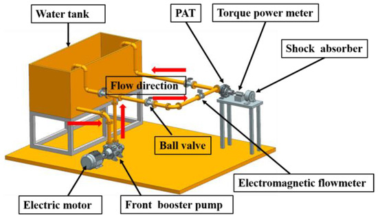 To validate the accuracy of the numerical simulations, an experimental test rig for the PAT was constructed. A three-dimensional model of the test rig is shown in Figure 5, and the experimental test rig for the PAT is presented in Figure 6. The key performance parameters, including the head, power, and efficiency, were calculated from the experimental data using Equations (32), (33), and (34), respectively.