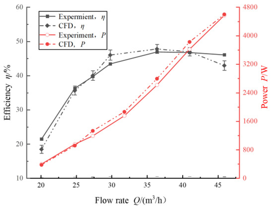 The experimental results indicate that the output power of the USSPAT increases with the flow rate. As shown in Figure 7, under the design operating condition, the experimentally measured power and efficiency of the USSPAT were 2.0 kW and 52.28%, respectively, compared to the numerical predictions of 1.94 kW and 51.65%. Overall, the trend observed in the numerical simulation is in good agreement with the experimental data. The relative deviation between the numerical and experimental results for both power and efficiency is less than 5%, which confirms that the simulation method meets the required accuracy standards.