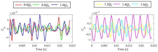 Figure 8 presents the experimentally measured time-domain plots of pressure pulsations under different flow rates. At the rotational speed of 1500 rpm, the fluctuation amplitude of the CP is on the order of ±5 × 10−4 at low flow rates, increasing to the order of ±1 × 10−3 at high flow rates. The overall variation remains relatively stable across the conditions. At 0.8Qd, the periodicity of the waveform is not pronounced. This is primarily attributed to the significant influence of vortices, secondary flows, and potential backflow in the outlet flow field under low flow rate conditions, which results in a complex frequency spectrum. Conversely, at higher flow rates, particularly at 1.4Qd, the periodicity becomes much more evident, with the peaks exhibiting a quasi-periodic arrangement. At this condition, a clear pulsation phenomenon dominated by a quasi-single frequency emerges, which is likely attributable to the influence of the BPF. However, at 1.6Qd, the flow unsteadiness is enhanced, but a single dominant periodicity is absent. This is mainly because the flow is characterized by the coexistence and interaction of turbulent pulsations and large-scale vortices. The analysis reveals that the pulsation intensity is lowest at the 0.8Qd condition. However, the waveform at this point lacks clear periodicity and exhibits irregular characteristics, which is primarily attributed to the influence of non-periodic, large-scale vortex structures and potential backflow under low flow rate conditions. In contrast, while the overall pulsation intensity at the 1.0Qd condition is higher than that at 0.8Qd, its signal is highly regular and displays significant periodic features. This periodicity is directly linked to the BPF, as confirmed by the frequency-domain analysis. Therefore, although the 0.8Qd condition has the minimum pulsation intensity, the 1.0Qd condition represents the most periodically stable operating point.