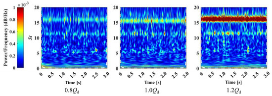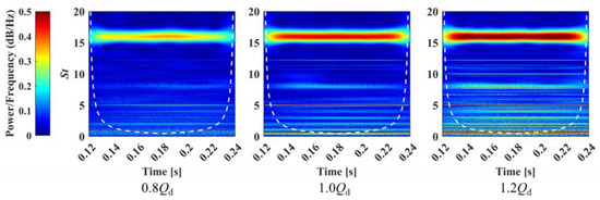 Figure 9 and Figure 10 present the time-frequency distributions of pressure pulsations at the turbine outlet monitoring point, obtained from the experimental measurements and numerical simulations, respectively. Overall, a strong agreement is observed between the experimental and numerical results regarding the evolution of the spectral characteristics with varying flow rates. At 1.0Qd, the flow field exhibits a high degree of stability and periodicity. Under the 0.8Qd in Figure 9 and Figure 10, the pulsation energy is predominantly concentrated within a narrow and distinct band at the BPF (St = 16), and this energy is uniformly distributed across the time domain. This indicates that under this condition, the pressure pulsations are primarily dominated by the periodic RSI resulting from the impeller’s rotation. Meanwhile, low-frequency instabilities, which are typically induced by flow separation or large-scale vortex structures, are effectively suppressed. At 0.8Qd, a significant region of energy concentration emerges in the low-frequency domain (St < 8). The experimental plot in Figure 9’s 1.0Qd reveals that these high-energy zones are intermittent in the time domain. This intermittency reflects the stochastic nature of real-world turbulence, where broadband turbulent fluctuations cause the energy associated with specific frequency bands to appear as intermittent features in the time-frequency plot. In contrast, the numerical results from the URANS method (Figure 9) exhibit a clean and continuous low-frequency energy band, failing to reproduce this stochastic intermittency. This is because the URANS approach is primarily designed to capture large-scale, deterministic periodic structures while averaging out the finer-scale, chaotic turbulent fluctuations. At 1.2Qd, the intensity of the outlet pressure pulsations reaches its maximum. The energy band at the BPF (St = 16) is not only at its highest intensity but is also significantly broadened. This is primarily caused by the intensified RSI at the high flow rate, coupled with strong turbulence induced by flow separation on the blade suction side. Concurrently, the energy in the low-frequency domain is also amplified. However, it manifests as a continuous, broadband noise signature, which is distinct from the intermittent vortex characteristics observed at low flow rates. This phenomenon is attributed to the interaction of multi-scale turbulent eddies under conditions of high turbulence intensity.