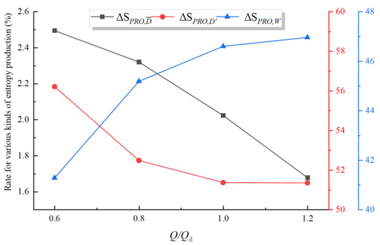 Local entropy generation is mainly divided into three types: direct dissipation entropy generation (), caused by viscous dissipation; turbulent dissipation entropy generation (), caused by turbulent dissipation; and wall entropy generation (ΔSPRO,W), caused by boundary layer effects. To better understand the types of entropy generation in the PAT under different flow rates, Figure 11 and Figure 12, respectively, show the values and proportion distribution of each entropy generation type under different operating conditions. It can be seen from the figures that the values of turbulent dissipation entropy generation and wall entropy generation both increase as the flow rate increases, which indicates that the internal energy loss within the PAT increases accordingly. By observing the entropy generation proportion curves, it can be found that as the flow rate increases, the proportions of turbulent dissipation entropy generation and direct dissipation entropy generation gradually decrease, while the proportion of wall dissipation entropy generation gradually increases. The proportion of direct dissipation entropy generation is less than 3%, reaching its value of 2.5% at 0.6Qd. The proportions of turbulent dissipation entropy generation and wall dissipation entropy generation are very large under different operating conditions. Among them, the proportion of turbulent dissipation entropy generation exceeds 50% under all conditions, reaching 56.2% at 0.6Qd. The proportion of wall dissipation entropy generation is at its minimum at 0.6Qd, with a value of 41.3%. Therefore, turbulent dissipation entropy generation and wall dissipation entropy generation can be regarded as the main sources of energy loss during the operation of the USSPAT, and the viscous dissipation entropy generation can be considered negligible.