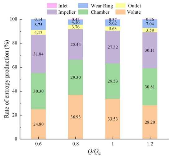 Figure 13 illustrates the distribution of entropy generation proportions among the different flow passage components of the PAT under various flow rates. Among these, the impeller, volute, and chamber consistently account for the largest shares of the total entropy generation across all flow rates, identifying them as the critical regions of energy loss. As the flow rate increases, the proportion of entropy generation in the impeller first decreases and then increases, reaching a minimum at 0.8Qd. This is primarily attributed to the mismatch between the inlet flow velocity and the blade inlet angle that occurs under low flow rate conditions. In contrast, the entropy generation proportion of the volute exhibits the opposite trend, initially increasing before decreasing. The energy loss proportions for the outlet section and the wear ring area follow a nearly identical trend, with both remaining at a relatively low level.