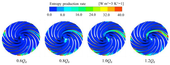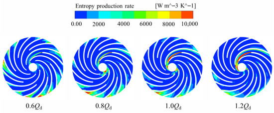 As indicated by the preceding analysis, the impeller is a critical region of energy loss in the PAT, and its internal losses are significantly influenced by the flow rate. Figure 14 presents the entropy generation rate distribution on the impeller mid-span at various flow rates. The figure reveals that regions of high entropy generation rate are primarily concentrated at the impeller inlet, outlet, and within the flow passage near the volute tongue. Furthermore, these high-entropy regions expand as the flow rate increases. A high entropy generation rate is observed at the trailing edge of the long blades; this is likely attributed to flow separation in the impeller outlet region, which is induced by the increased flow rate and results in more disordered flow. The entropy generation at the blade trailing edges and the impeller outlet increases significantly with the flow rate, indicating that the increased flow rate leads to a more disordered flow field in the impeller outlet region. At 0.6Qd, the outlet region of the long blades shows almost no areas of high entropy generation. The high-entropy regions within the impeller mostly coincide with areas of vortex formation, indicating that vortices are a significant factor in causing energy loss.