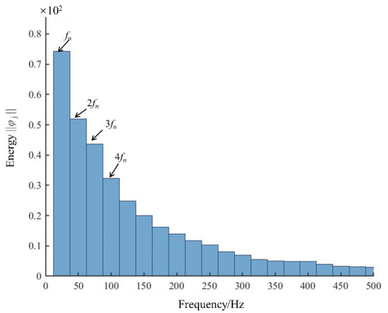 A modal decomposition was performed on the impeller velocity field. Figure 16a shows the resulting eigenvalue distribution from the DMD analysis. It is observed that the eigenvalues are located predominantly on or near the unit circle, with only a few located inside the circle. This indicates that the flow field within the impeller under this condition is primarily composed of periodic or stable modes. Since the eigenvalues appear in complex conjugate pairs, they are symmetric about lg (λ), and each conjugate pair represents a single oscillatory mode. Eigenvalues situated on the unit circle correspond to flow structures that are periodically stable, while those inside the unit circle represent weakly decaying. Therefore, the modes extracted from the DMD of the impeller flow field at 1.0Qd are predominantly stable. Figure 16b shows the decay rate distribution of the impeller velocity field modes. The decay rates of the first several modes are predominantly greater than zero, indicating that these modes do not exhibit temporal decay. Figure 17 presents the modal energy distribution of the impeller, where modal energy serves to evaluate the relative contribution of each mode to the flow field dynamics. The modes with the highest energy are all concentrated in the low-frequency range. The first four modes correspond to frequencies of 25, 50, 75, and 100 Hz, respectively. It can be observed that the frequencies of these first four dominant modes are all integer multiples of the shaft frequency.