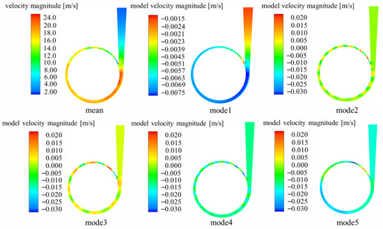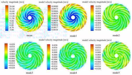 Figure 18 displays the averaged flow field of the impeller alongside the spatial structures of the first five dominant DMD modes. Among the modes of the PAT velocity field, mode 1 corresponds to the shaft frequency, and its spatial structure closely resembles the time-averaged flow field. As the most energetic mode, it represents the primary periodic fluctuation superimposed on the mean flow. Its coherent structures are primarily concentrated at the impeller inlet, characterized by a distinct high-velocity region near the pressure side of the blades, exhibiting a circumferential symmetry related to the blade count. This clearly reveals the formation of high-velocity fluid pockets at the impeller inlet, which is a direct consequence of the RSI between the volute and the impeller. Therefore, mode 1 is identified as the fundamental RSI mode. Mode 2, corresponding to a frequency of 50 Hz (2f0), features coherent structures distributed throughout the flow passage, with a notable presence at the impeller inlet, suggesting it is associated with unsteady phenomena such as flow recirculation in this region. Modes 3 and 4, corresponding to 3f0 and 4 f0, respectively, represent higher-order harmonics of the fundamental RSI mode, indicating the influence of the impeller’s rotation on the flow field through RSI. The coherent structures of modes 3 and 4 are mainly distributed near the impeller inlet, and their velocity distributions are similar, showing an alternating pattern of maxima and minima. As the mode order increases, the circumferential wavenumber of the spatial structures also increases, manifesting as a greater number of alternating positive and negative velocity fluctuation zones around the circumference. This reflects the emergence of smaller-scale flow details under the influence of RSI. The concentration of their energy near the impeller inlet confirms that these higher-frequency pulsations remain closely linked to the RSI. The spatial structure of mode 5 is markedly different from the preceding harmonic modes. Its energy is not uniformly distributed at the impeller inlet but is instead localized at the junction where the main flow passage meets the splitter blades. This is primarily attributed to the shedding of vortex structures originating from flow separation at this junction. Compared to modes 3 and 4, mode 5 consists of a larger number of smaller-scale, less symmetric coherent structures, which reflects the breakup and dissipation of unstable fluid parcels within the impeller passages.