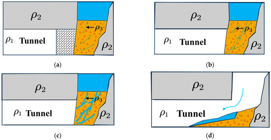 Figure 1b). When the karst conduit connects with an underground water-bearing structure or receives increased water recharge, the permeability of the rock mass and infill material changes significantly. During this stage, groundwater infiltrates the infill, leading to its gradual liquefaction. Continuous scouring by groundwater causes fine particles within the infill to be eroded and transported. As a result, the initial fractures expand, and previously isolated microcracks gradually interconnect to form relatively stable seepage pathways. Dripping water may appear within the tunnel at this stage.