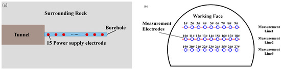 . A total of 15 current electrodes are installed in the boreholes, spaced at 2 m intervals. On the tunnel face, three measurement lines are arranged vertically, each with nine measurement points, yielding a total of 27 measurement electrodes (