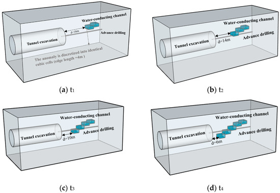 For the monitoring scenario addressed by the inversion method in this study, a temporal dimension is introduced based on traditional geophysical exploration techniques, transforming the process from a single measurement approach into a multi-temporal measurement strategy. This shift in methodology is characterized by conducting repeated measurements at different time intervals while maintaining the same observation configuration and measurement location, as excavation progresses. The key aspect of this approach lies in the progressive update of subsurface electrical properties through time-dependent inversion computations. Unlike conventional geophysical methods, which typically rely on a single measurement and corresponding inversion analysis, the incorporation of the time dimension allows for continuous monitoring. By repeatedly measuring and inverting data at successive time points, the temporal evolution of the subsurface electrical response is captured, forming a continuous dataset. Based on borehole resistivity inversion, the final model parameter