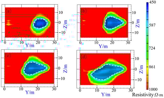 In summary, seepage-instability-induced water inrush in filling-type karst conduits occurs under the combined effects of tunnel excavation disturbance and high-pressure groundwater seepage. The evolution of this disaster can be divided into four stages: the initial disturbance stage, the fracture connection stage, the expansion and extension stage of the water-conducting channel, and the final penetration stage forming a continuous inrush path. In the initial disturbance stage, the surrounding rock is predominantly intact, with low porosity and dry conditions. Due to the inherently high resistivity of the rock mass, the overall electrical resistivity remains high. However, local water infiltration into microcracks slightly increases conductivity, leading to isolated low-resistivity anomalies in a limited area behind the tunnel face. In the fracture connection stage, as the fracture network develops, the resistivity of the surrounding rock decreases. Directional conductive paths begin to form, and low-resistivity strips and channels become apparent. In the expansion and extension stage, with increasing porosity and continuous particle loss, the resistivity of the surrounding rock continues to decline. The main water-conducting channel shows a significant reduction in resistivity, and surrounding areas are also affected, resulting in a broader zone of resistivity decline. In the final penetration stage, as the granular infill material is nearly completely eroded and the water flow becomes clear, the resistivity of the surrounding rock drops sharply. A continuous low-resistivity body is formed, indicating the complete establishment of a hydraulically connected inrush pathway.