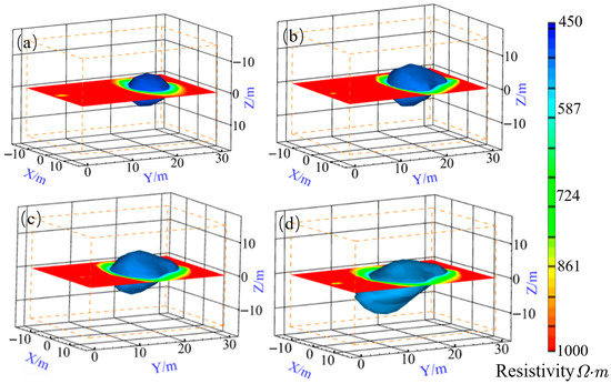 . Using this borehole resistivity configuration, a total of 12,150 observation data points are acquired. Based on this observation system, a water-conducting channel model with an inclined orientation was constructed. Although water inrush may occur along various orientations, previous studies have shown that inclined channels are the most representative and hazardous form [