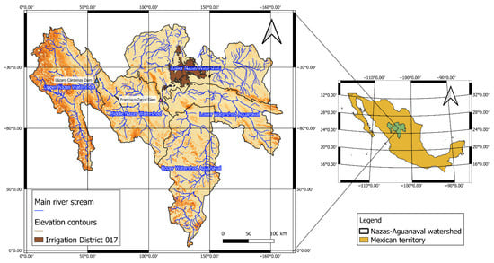 The Nazas–Aguanaval watershed comprises 90,072 km2 and has a mean annual precipitation of 385 mm. This watershed can be divided into five subbasins: upper, middle, and lower Nazas and upper and lower Aguanaval. Precipitation is 47% higher in upper Nazas, which translates into a mean annual precipitation of 566 mm. For this reason, the Lázaro Cárdenas dam was built at the outlet of this subbasin. Conversely, lower Nazas and lower Aguanaval exhibit 31 and 21%, respectively, less precipitation. A map, prepared, using QGIS3 of the Nazas–Aguanaval watershed is shown in Figure 1.