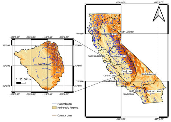 The Tulare hydrologic region covers an area of 43,290.37 km2 (10.6 million Ac) and receives a mean annual precipitation of 365 mm (14.4 in). Precipitation is seasonal and is concentrated in winter months. However, there are important differences in precipitation among watersheds that are within this hydrologic region. The watershed that receives the most precipitation is the Upper King watershed, which shows a mean annual precipitation of 839.56 mm, 130% higher than the mean annual precipitation in the whole watershed. Next, the Upper Kern watershed exhibits a mean annual precipitation of 660 mm. Upper Kaweah receives 35% more precipitation than the mean of the watershed, with 495 mm. These watersheds are in the eastern part of the hydrologic region, where the Sierra Nevada is located and orographic precipitation from atmospheric rivers is stored in snowpack. The Tulare Lake Basin is shown in Figure 2.
