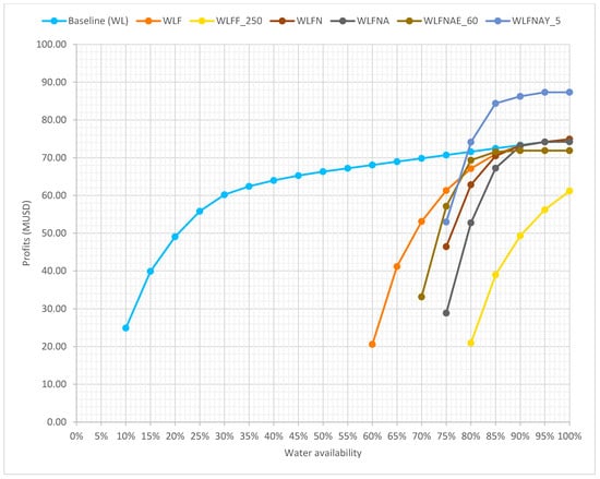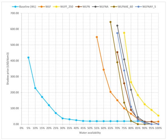 Scenario 1 consists of only having water and land restrictions. The water availability is set at 927 hm3 and the land availability at 56,392 ha, representing the respective values observed in 2022. A set of models considers a range of water availability from 100 down to 5%. The shadow price does not change between 100 and 90% (16 USD/dam3), shifts to 19 USD/dam3 between 85 and 50% and increases at a higher rate below 45% availability, amounting to 420 USD/dam3 at 5% water availability.