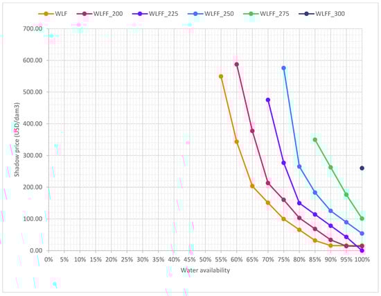A chart with the shadow prices is shown in Figure 4. Noticeably, to produce 2.0 million tons, 60% water availability is required, and full water availability is required to produce 3 million tons under this scenario. When production is increased, the shadow prices will increase as well. For WLFF_200, the shadow price increased from 14.04 USD/dam3 at 100% availability to 587.44 USD/dam3 at 60% availability. For WLFF_300, the shadow price reached 259.98 USD/dam3, even at 100% water availability.