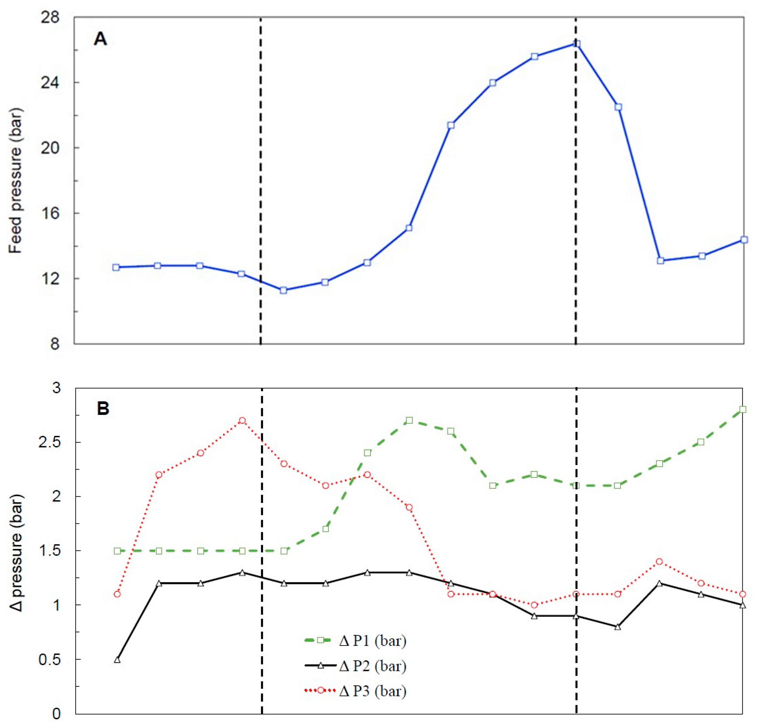 3.3.2. Feed Pressure and Hydraulic Behavior