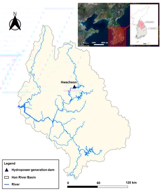 Location of the Hwacheon Dam in the Han River Basin, South Korea. The Han River Basin is the largest river basin in the South Korea. Source: National Geographic Information Institute (NGII, https://www.ngii.go.kr/; accessed on 30 June 2025).