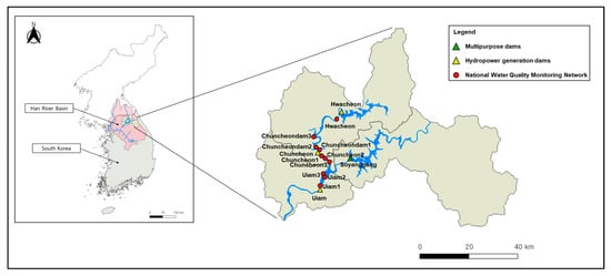 We collected data from ten water quality monitoring stations located between the Hwacheon Dam and the Uiam Dam. One station (Hwacheon, 38°05′35″ N, 127°45′26″ E) lies downstream of the Hwacheon Dam. Three stations in Lake Chuncheon (Chuncheon Dam 1: 37°58′44″ N, 127°39′00″ E; Chuncheon Dam 2: 37°58′08″ N, 127°40′06″ E; Chuncheon Dam 3: 38°01′49″ N, 127°38′48″ E) represent conditions within the reservoir. Three stations downstream of the Chuncheon Dam (Chuncheon 1: 37°53′58″ N, 127°44′36″ E; Chuncheon 2: 37°56′47″ N, 127°42′23″ E; Chuncheon 3: 37°55′19″ N, 127°43′02″ E) were used to monitor riverine water quality. Finally, three stations in Lake Uiam (Uiam Dam 1: 37°50′15″ N, 127°40′33″ E; Uiam Dam 2: 37°53′37″ N, 127°41′41″ E; Uiam Dam 3: 37°52′38″ N, 127°41′48″ E) were included to capture spatial variability within the reservoir (Figure 4 and Figure 5). The downstream water quality data were obtained from the Water Environment Information System (https://water.nier.go.kr/web; accessed on 30 June 2025), which provides open public access.