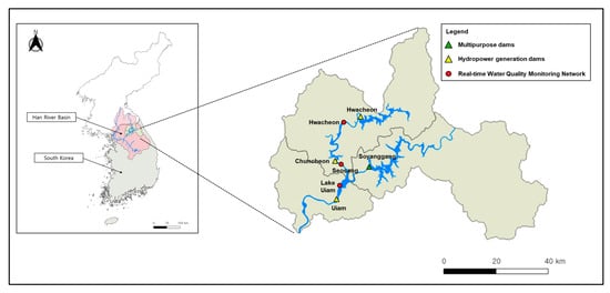 Distribution of the real-time water quality monitoring network stations in the study area. A total of three monitoring stations are located between Hwacheon Dam and Uiam Dam. Source: National Geographic Information Institute (NGII, https://www.ngii.go.kr/; accessed on 30 June 2025).