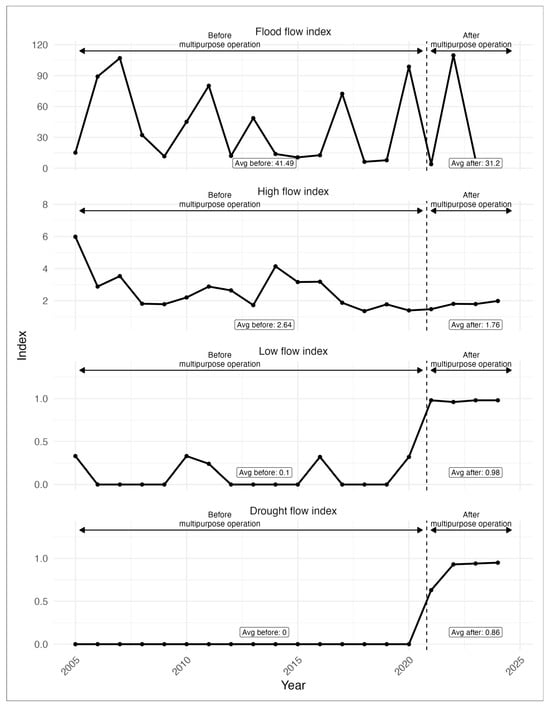 We calculated the annual flood flow, high flow, normal flow, low flow, and drought flow at the Guman Bridge based on the water year from 2005 to 2024 (Figure 7). From 2005–2020 (before multipurpose operation), the Guman Bridge showed high flood, high, and normal flows (averages: 1037.0 CMS, 54.5 CMS, and 23.9 CMS) with very limited low flow (2.4 CMS) and no drought flow. After the operational shift (2021–2024), flood, high, and normal flows declined to 503.5 CMS, 42.6 CMS, and 20.8 CMS on average, while low and drought flows rose sharply to 20.3 CMS and 17.8 CMS on average. These patterns indicate reduced high flow magnitudes and strongly augmented low flow continuity consistent with constant releases under multipurpose operation.
