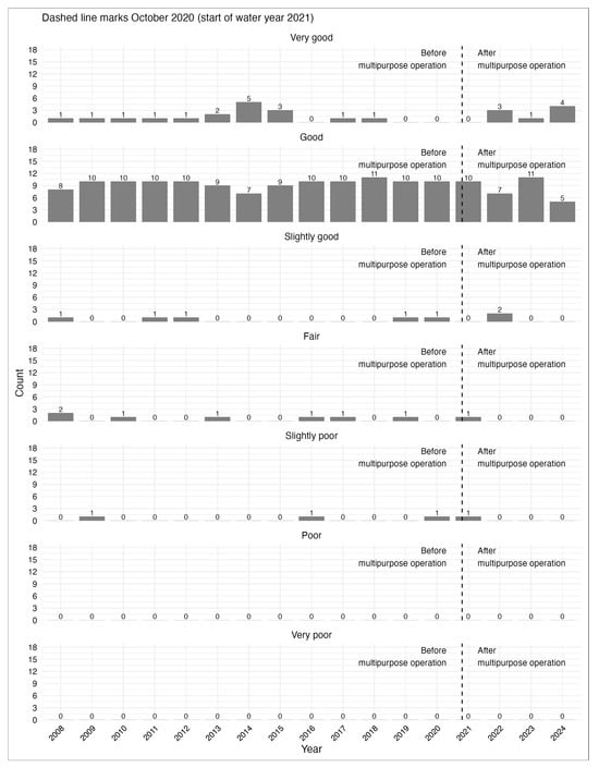 Monthly water quality records were examined for the downstream Hwacheon station covering January 2008 to September 2024, spanning 201 months of observations. From 2008 to 2020, the Hwacheon station showed predominantly good grades, with intermittent very good months that peaked at five in 2014 and three in 2015 (Figure 10). Fair months appeared in several years, including 2008, 2010, 2013, 2016, 2017, 2019, and 2020, while slightly poor conditions occurred in 2009, 2016, and 2020. No poor or very poor grades were recorded during this period, indicating generally high but occasionally variable water quality. After the operational change, water quality further improved and stabilized. The transition year 2021 still included one fair and one slightly poor month, but from 2022 onward, lower grades disappeared entirely. Between 2022 and 2024, only very good, good, and a few slightly good months were observed, with the number of very good months increasing to three in 2022, one in 2023, and four in 2024. The water quality after 2020 remained consistently high and showed clear improvement compared to the pre-change period, reflecting enhanced stability following the shift to multipurpose operation.