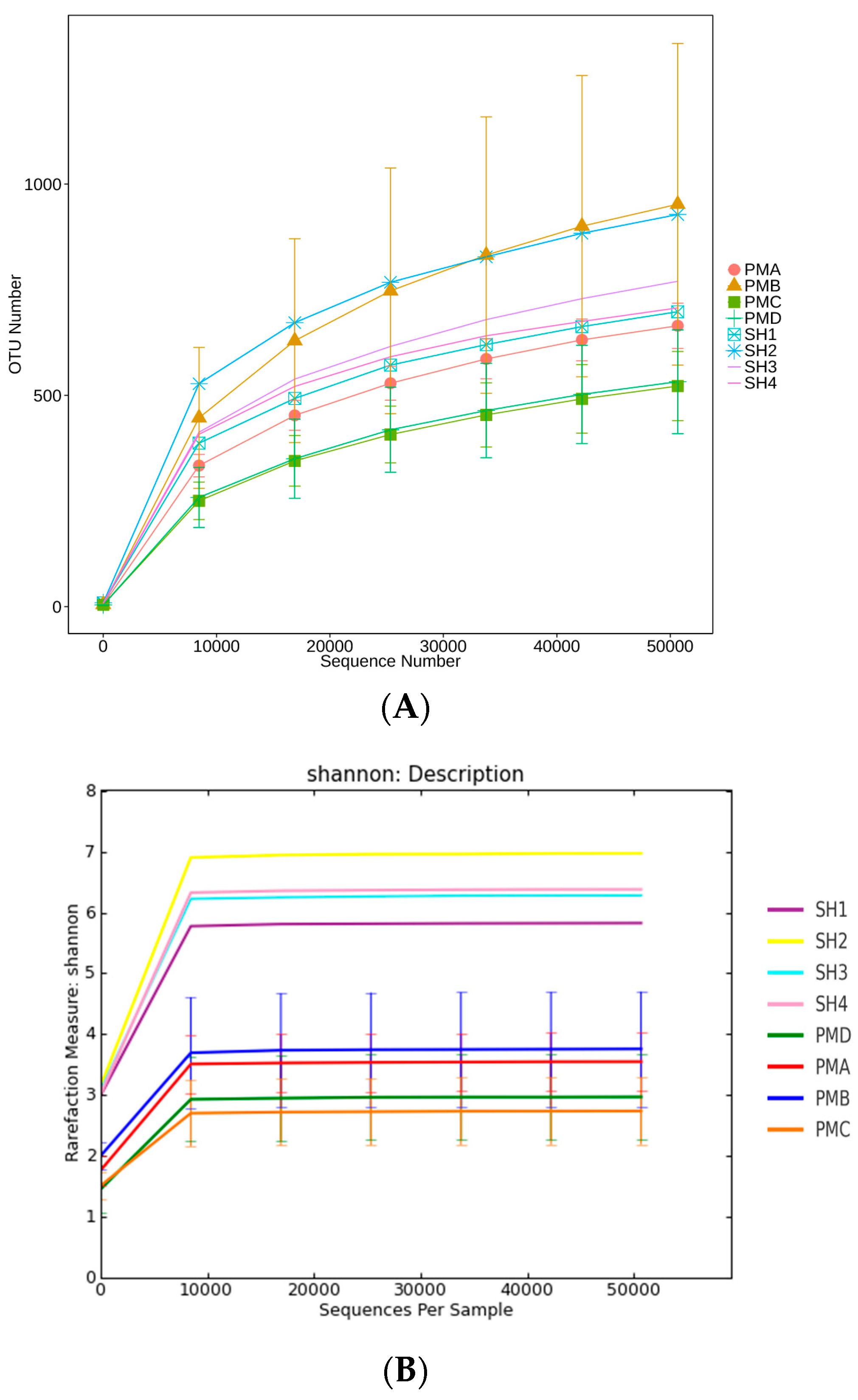 4.2. OTU Cluster Analysis of Prawn Gut and Its Aquaculture Water Body