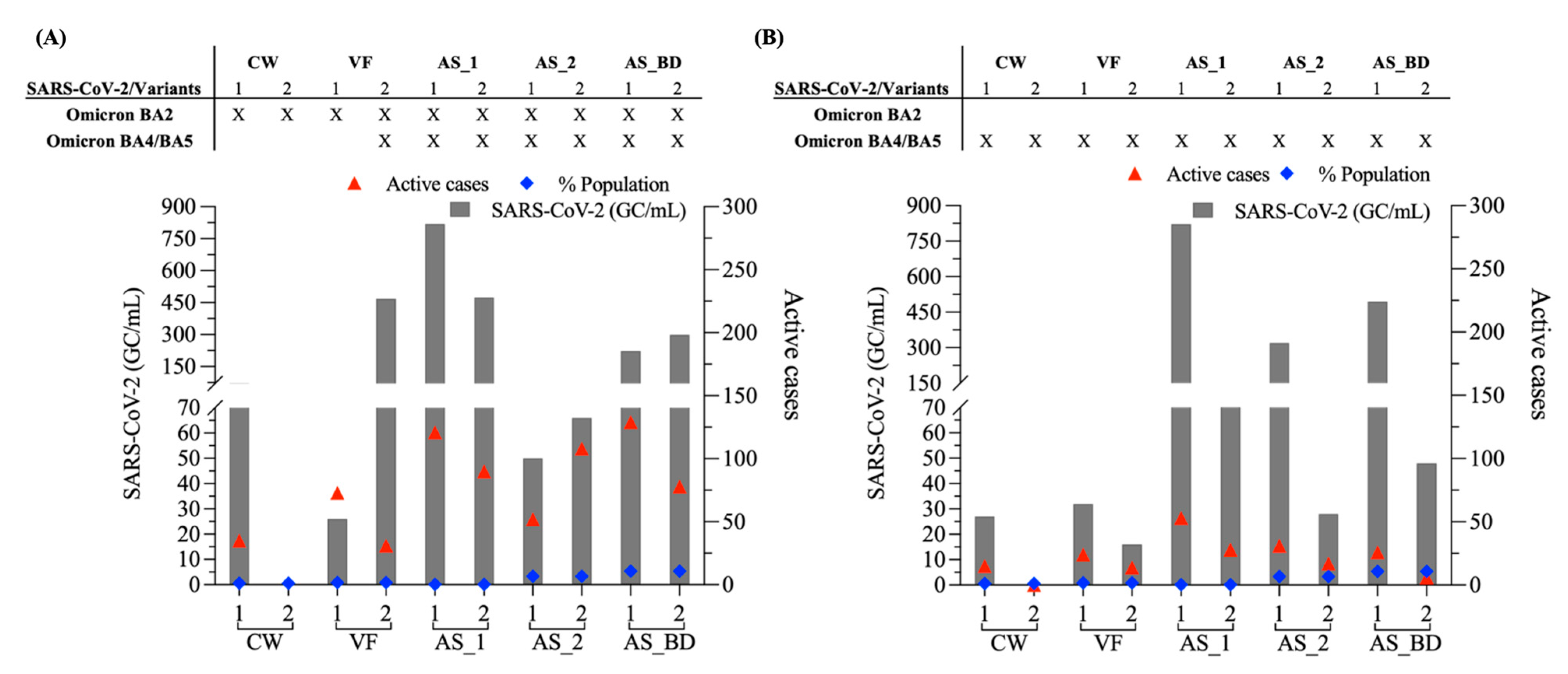 - Wilhelm, A.; Scotch, J.; Mainert-Berning, C.; Bastian, D.; Ciesek, S.; Teichgräber, B.; Wintgens, T.; Weber, F.; Widera, M. Early detection of SARS-CoV-2 Omicron BA.4/5 German wastewater. Viruses 2022, 14, 1876. [Google Scholar] [CrossRef] [PubMed]