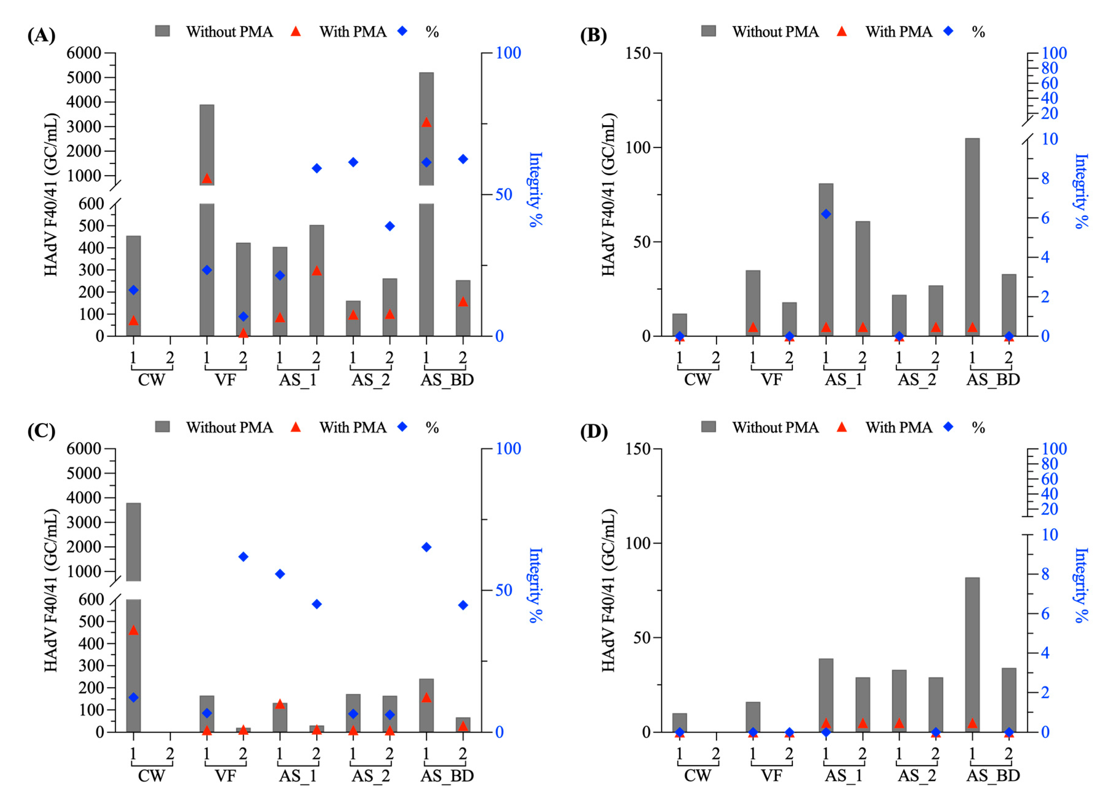 - Shaheen, M.; Ahmed, N.; Badr, K.; Elmahdy, M. Detection and quantification of adenovirus, polyomavirus, and papillomavirus in urban sewage. J. Water Health 2024, 22, 401–413. [Google Scholar] [CrossRef]