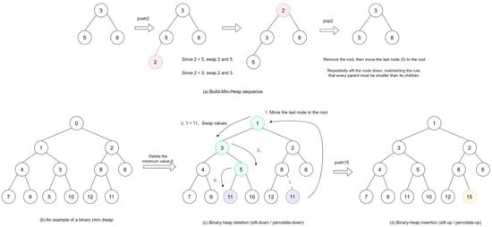 Heap (min-heap) is a conventional priority queue offering an O(log N) performance (where N denotes the number of items in the queue) []. The min-heap property requires that each element’s priority surpass its two children, preserving this invariant at all times. Consequently, the highest-priority element always resides at the root of the tree. This characteristic makes heaps a widely used data structure in the Priority-Flood algorithm because it guarantees that the highest-priority units are processed first. However, during the computation of the Priority-Flood algorithm, one must pop the highest-priority element and examine all adjacent cells to enqueue them. If the priority of a cell to be updated is lower than that of the root, a global reconfiguration from the root is triggered (Figure 2a). This dynamic adjustment mechanism of the heap collides fundamentally with the access pattern of the Priority-Flood algorithm, becoming a critical performance bottleneck. By contrast, when newly encrypted data do not induce frequent heap adjustments or when the priority distribution minimizes the need for upwards percolation, the algorithm’s throughput is markedly enhanced.