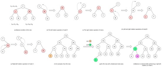 Compared with heaps implemented via arrays, a pointer-based binary search tree offers greater structural flexibility []. In a binary search tree, nodes are linked by pointers, and moving or reorganizing nodes typically involves simply reassigning or swapping pointers rather than copying the data stored in the nodes themselves. The AVL tree is a class of self-balancing BSTs that preserves the core property of ordinary BSTs: every node’s left subtree contains values less than the node’s value, and every node’s right subtree contains values greater than the node’s value. This property maintains the orderly arrangement of data within the tree. Moreover, a balanced BST maintains a balance indicator for each node to measure the local height difference, ensuring that the height disparity between the left and right subtrees of any node does not exceed 1, thereby resulting in the worst-case time complexity of the insert, delete, and search operations O(log n). This stringent balance endows AVL trees with notable advantages in query-intensive applications, particularly in scenarios where lookups far outnumber data updates (Figure 3).