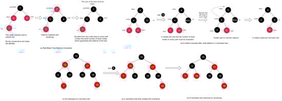 AVL trees guarantee stable sorting performance through rigorous balancing, but this introduces additional computational overhead because of node rotations []. RBTree maintains an approximately balanced tree structure via node colour attributes (each node is either red or black) and supplementary constraints [], trading these for fewer structural rotations (Figure 4). Consequently, the time complexity of red-black trees is on par with that of AVL trees, yet the number of rotations required during insertions and deletions is typically lower. Owing to the reduced rotation count, red-black trees often outperform AVL trees in general scenarios that demand efficient dynamic updates while also requiring high query performance.