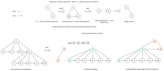 Compared with a fully ordered and more complex red-black tree used as a priority queue, the pairing heap offers a simpler implementation with advantageous amortized performance characteristics (Figure 5). A pairing heap is built upon two basic operations—linking and pairing []—and regards the heap as a forest of root nodes, maintaining the heap-order property through successive pairwise merge operations []. Its insert, merge, and find-min operations are highly efficient in most implementations, typically outperforming binary heaps. In both theoretical analyses and empirical studies, the amortized times for insert, merge, and find-min operations are O(1); delete-min requires several rounds of pairing and merging among the root subtrees, with an amortized time of O(log n). Consequently, pairing heaps are particularly well suited for scenarios that demand frequent insertions and the extraction of the minimum (or maximum) element.
