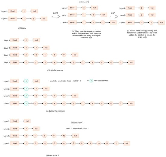 Concept of a skip list. (a) Illustration of the layered, multilevel linked-list structure of a skip list. (b) Insertion process: the new node’s level is determined by a random-generation mechanism, after which the node is inserted at the corresponding levels. (c) Deletion of the minimum-value node, in which the node pointed to by head→next [0] is accessed directly, and pointers are updated from the bottom layer up to its highest level to bypass the target node. (d–f) State changes in a skip list after the minimum value of 1 are deleted and the new value of 12 is inserted.