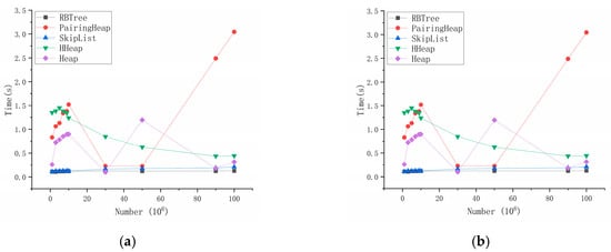 The Hold model, which serves as a conventional benchmark for performance evaluation [,], is intentionally simple and refrains from making excessive assumptions about the input dataset. Building on a dataset similar to that used in the previous section, this paper assumes a priority queue containing N elements and repeatedly performs a single operation 106 times (a dequeue operation immediately followed by an enqueue operation) so that the timing function can record precise timing information []. Each time an element is dequeued, we increment it by a random value drawn from a uniform distribution in [0, 50] and re-enqueue this modified element; the results are shown in Figure 9.
