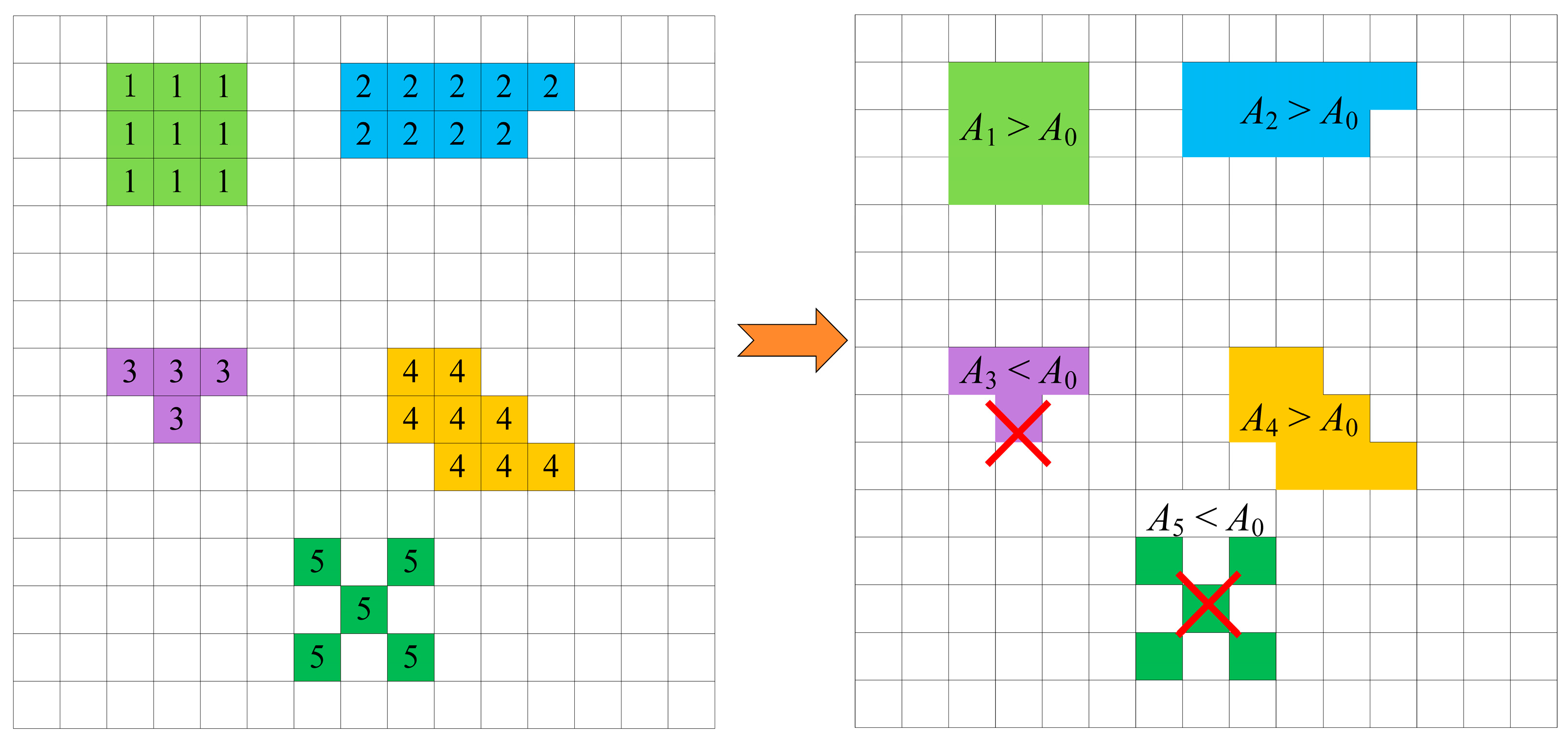 - Delineation of drought patches. First, for each monthly 2D drought index grid, we identify cells below the drought threshold (SZI[CO2] < −1). Then, using a 3 × 3 neighborhood to group spatially adjacent drought cells, cells that are drought-affected in adjacent positions are grouped and assigned a common identifier, merged into a single drought patch (Figure 2). If a drought cell has no adjacent drought neighbors, assign a new identifier for a new patch; repeat until all cells for that month are processed. This yields multiple drought patches in different areas. Apply a given area threshold (A0) to screen patches: patches larger than A0 are defined as drought events (Figure 2, A1, A2, and A4), while patches smaller than A0 are discarded (Figure 2, A3 and A5). A0 is also used to determine temporal continuity between patches, preventing the merging of unrelated or weakly related drought events across adjacent months [34].