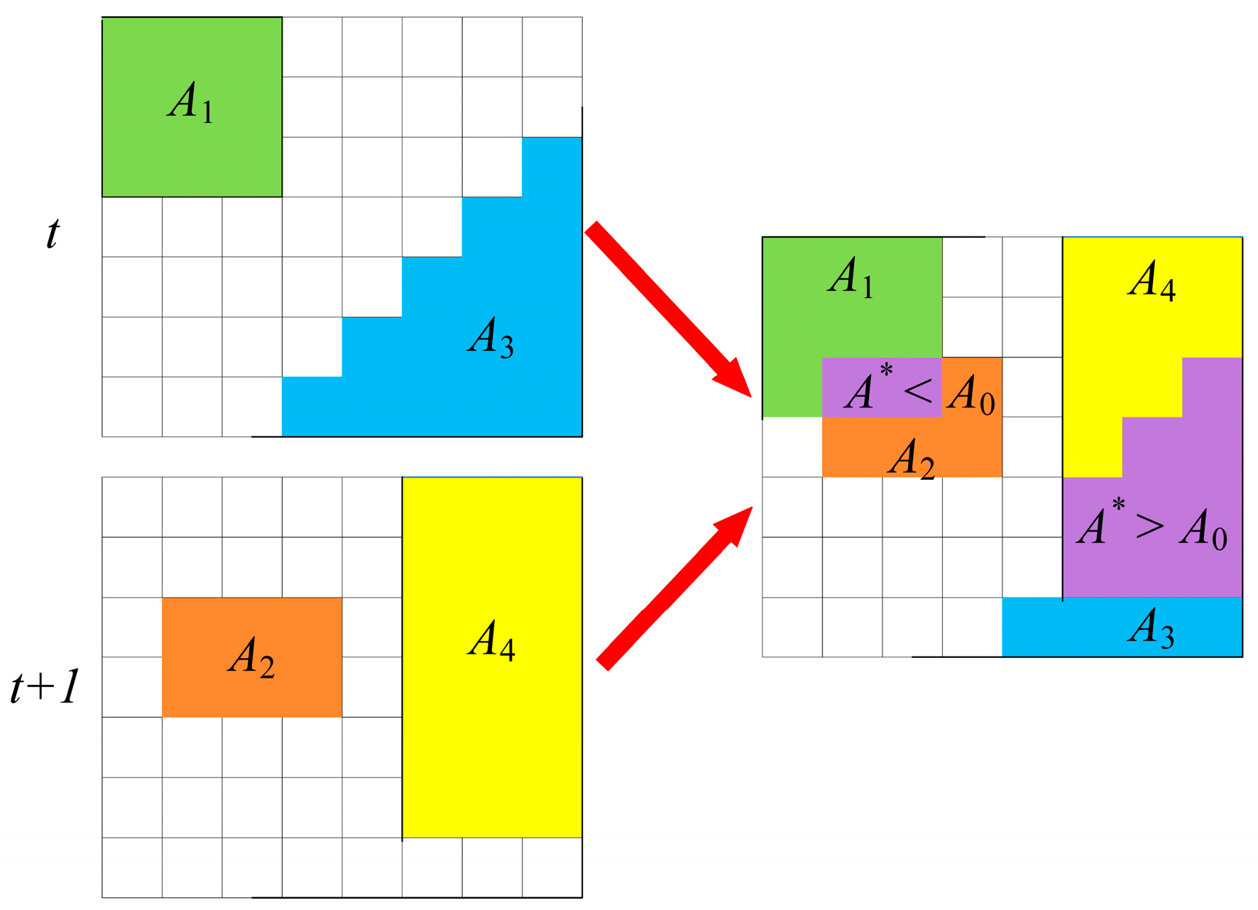 - Temporal connection of drought patches. After identifying monthly drought patches, we need to determine whether patches in adjacent months are connected and can form a single drought event. Let a patch at time t have area At, the corresponding patch at t + 1 have area At+1, and their overlapping area be A*. If A* > A0, At and At+1 are considered temporally continuous and belong to the same drought event (A3 and A4); otherwise, they are treated as two independent drought events (A1 and A2) (Figure 3). Following this rule, evaluate the overlap A* between patches at successive times; when A* < A0, the drought event is deemed to have ended, and the patches identified as the same event are assigned the same identifier. Repeat this process to link all patches in time, producing 3D continuous drought bodies and yielding multiple 3D drought events.