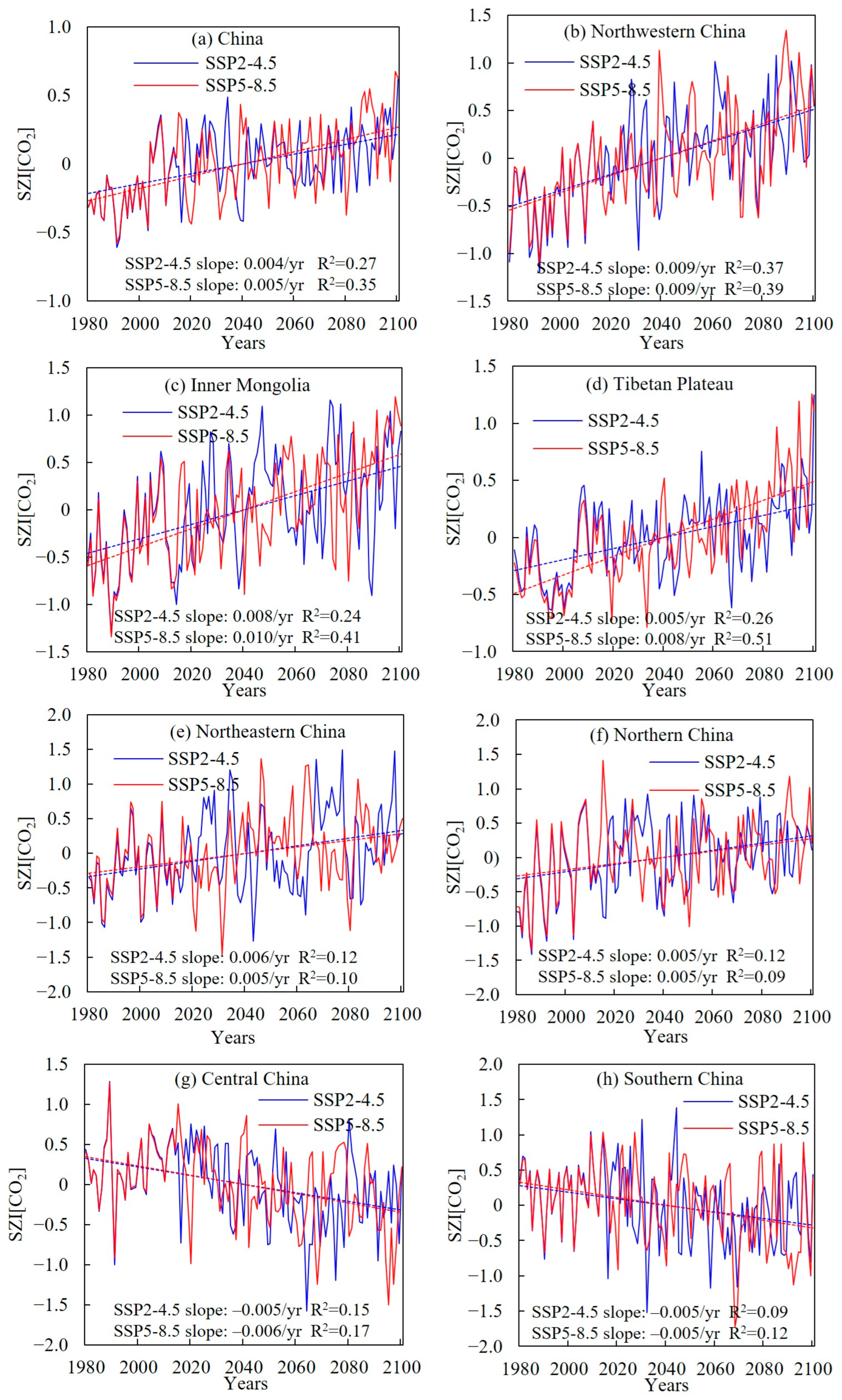 - In Northwest China, Inner Mongolia, the Tibetan Plateau, Northeast China, and North China, the SZI[CO2] shows a significant increasing trend, while the affected drought area exhibits a decreasing trend, indicating a future wetting trend in these regions. Conversely, Central China and South China show signs of becoming drier, with increases in drought frequency, duration, and severity.