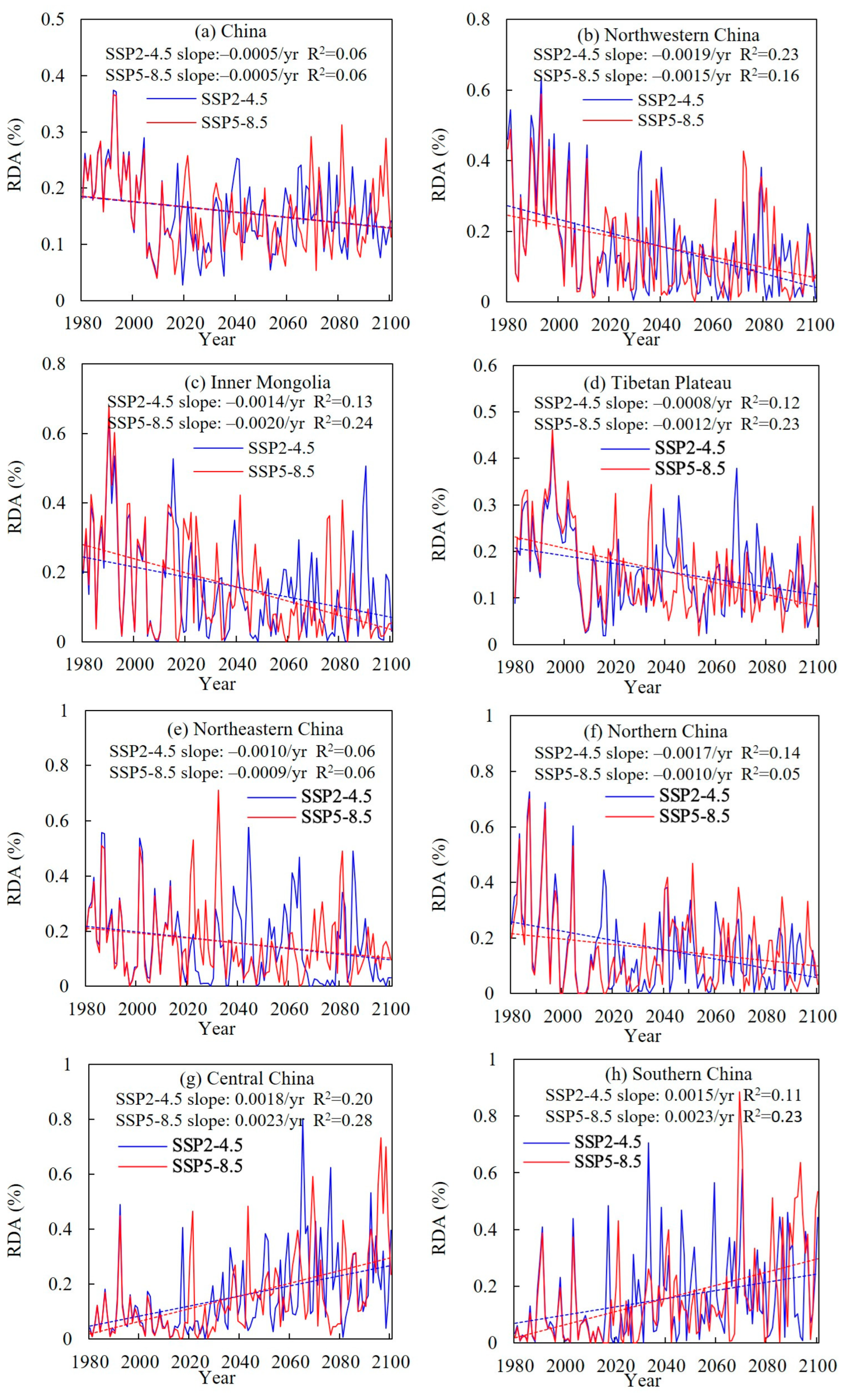 - Li, B.; Liu, D.; Yu, E.; Wang, L. Warming-and-wetting trend over the China’s drylands: Observational evidence and future projection. Glob. Environ. Change 2024, 86, 102826. [Google Scholar] [CrossRef]