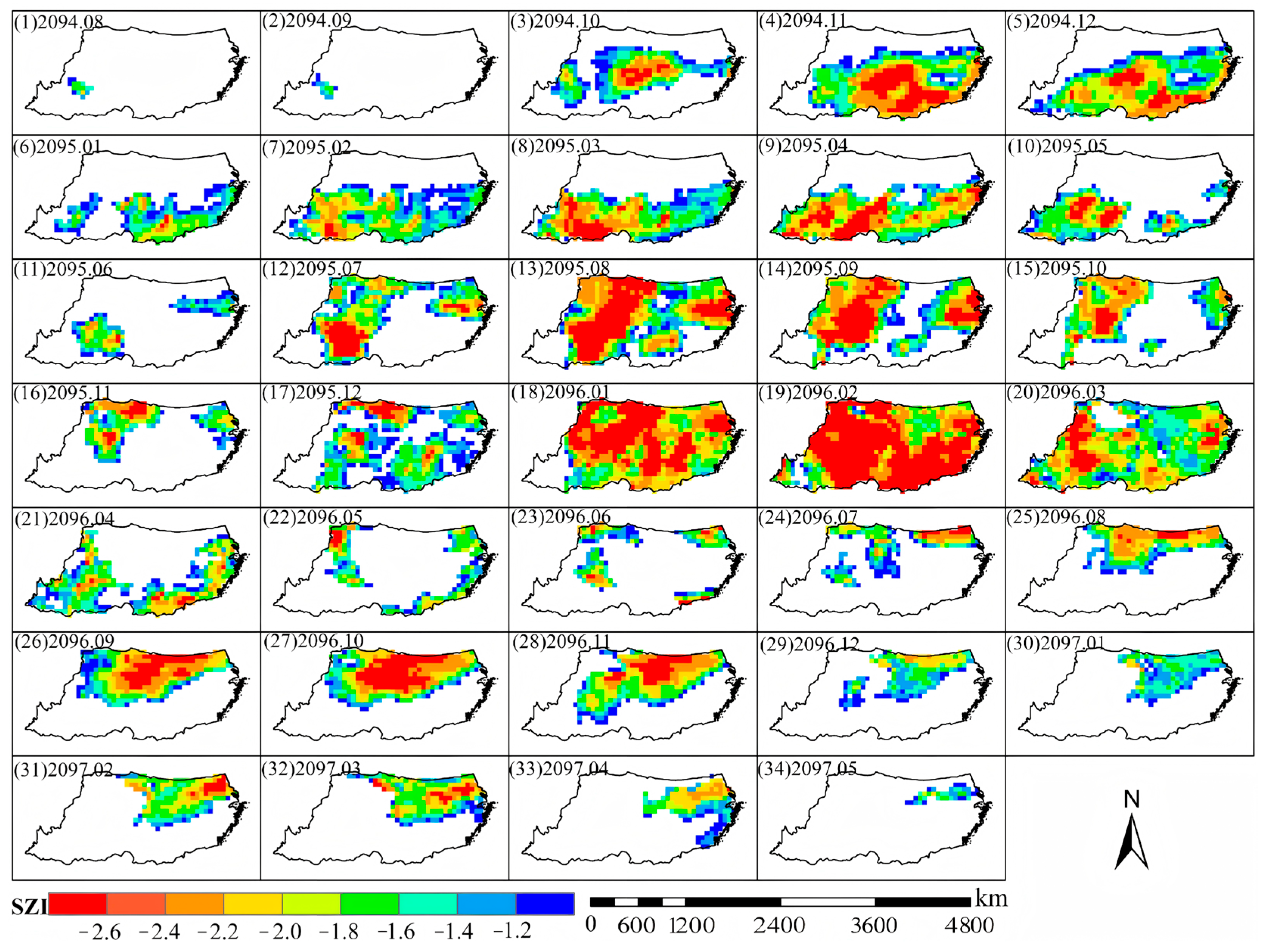 3.2. Spatiotemporal Dynamics of a Representative Future Drought Event