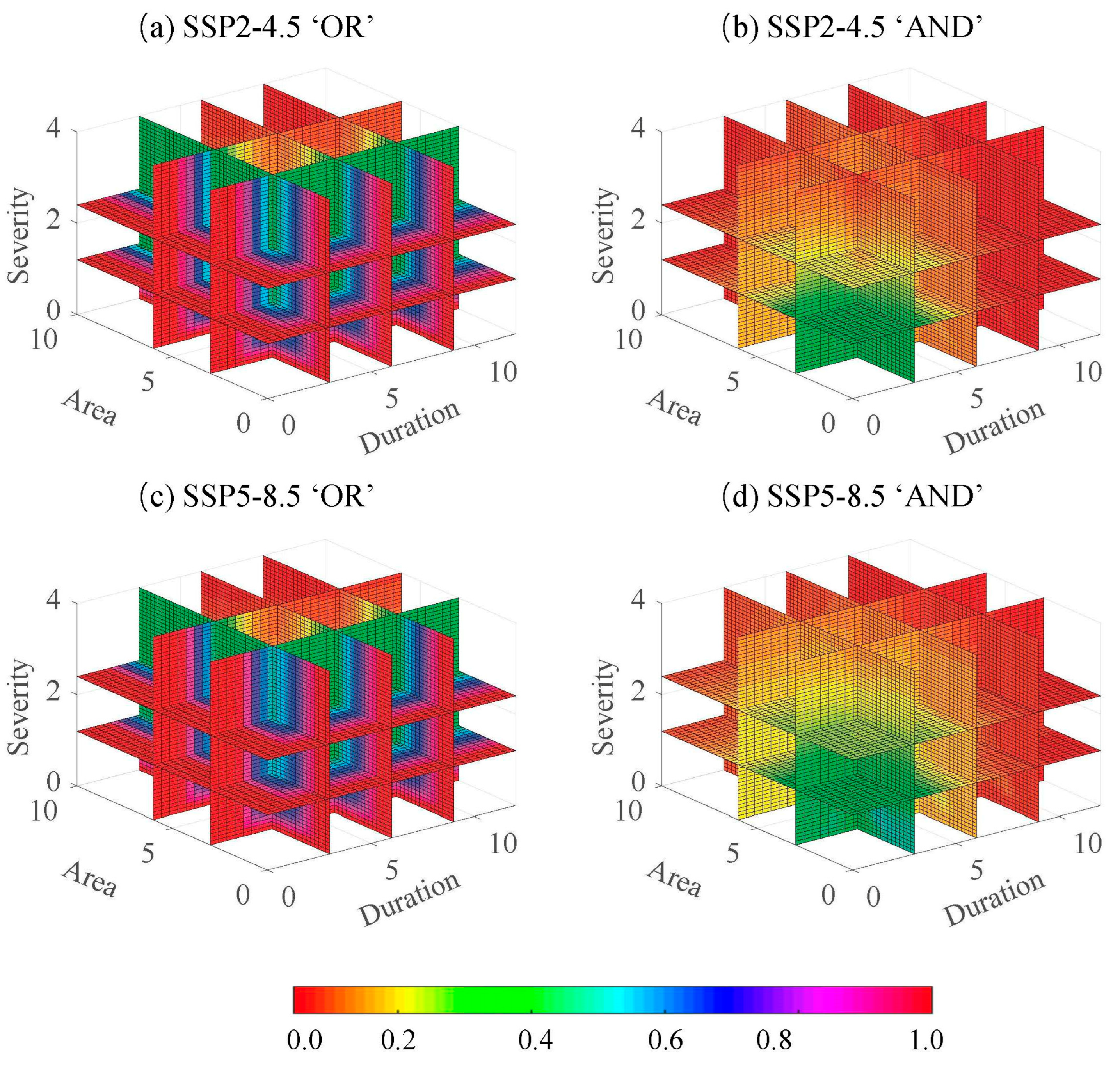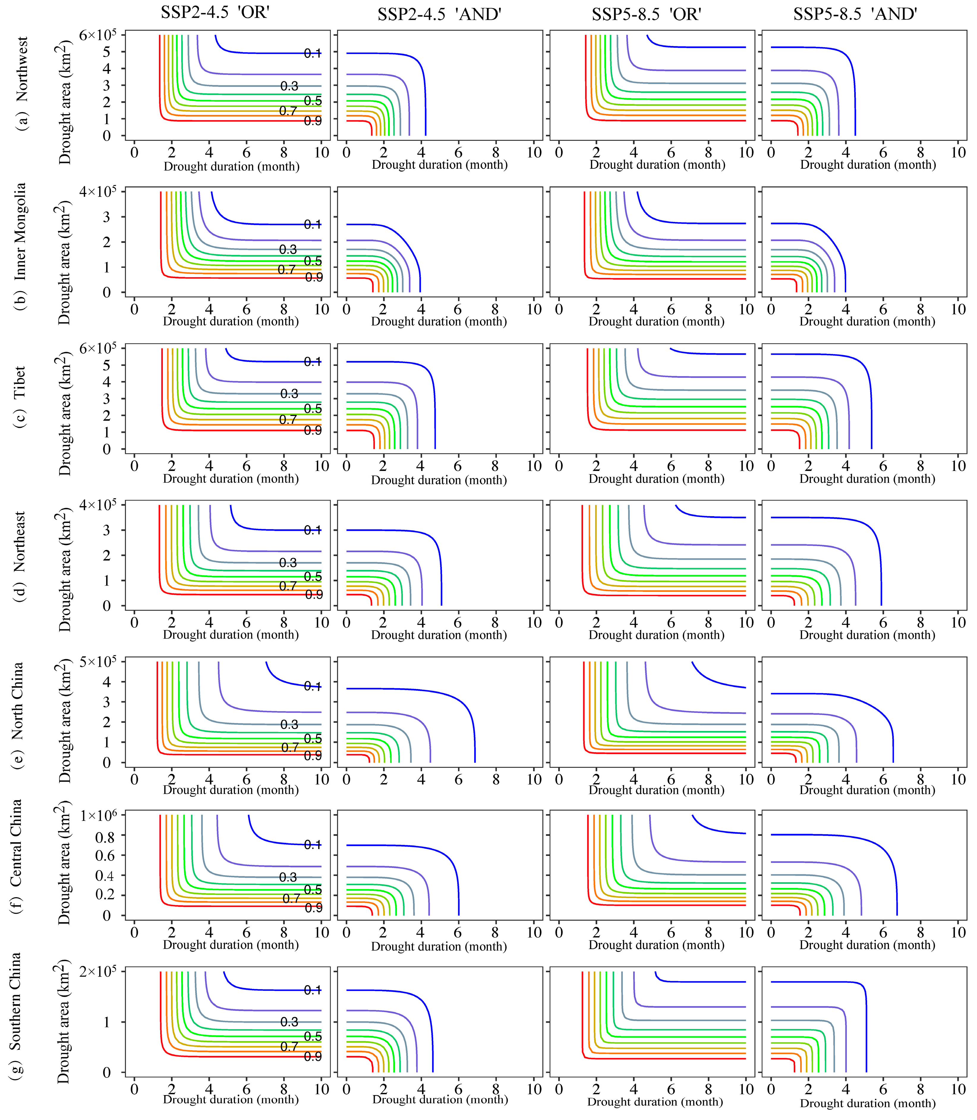 - When the same values of drought features are considered, the joint occurrence probability of drought under SSP5-8.5 is higher than under SSP2-4.5. Regions with notable differences include the Tibetan Plateau, Central China, and South China. The conditional probability of drought occurrence considering three features is significantly higher than with only two features, indicating that ignoring any one drought characteristic is likely to lead to the underestimation of the probability of severe drought events.